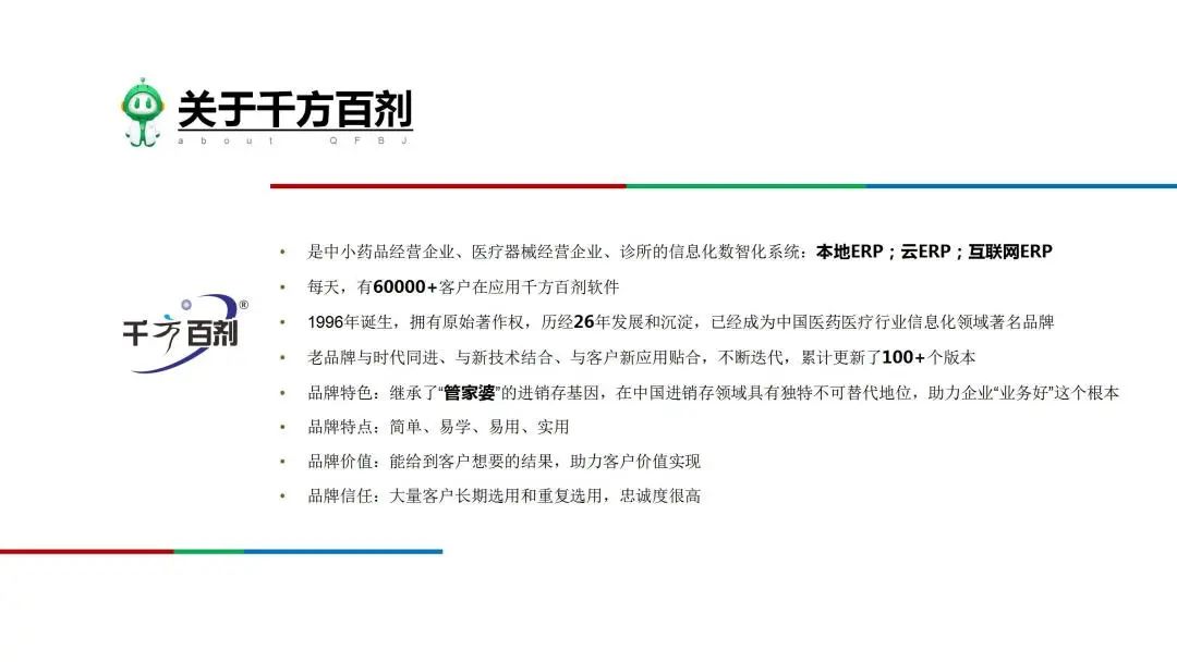 “千方百剂医药管理系统”系列产品已经成功应用于国内几千家医药企业,在医药流通行业享有良好的用户口碑。